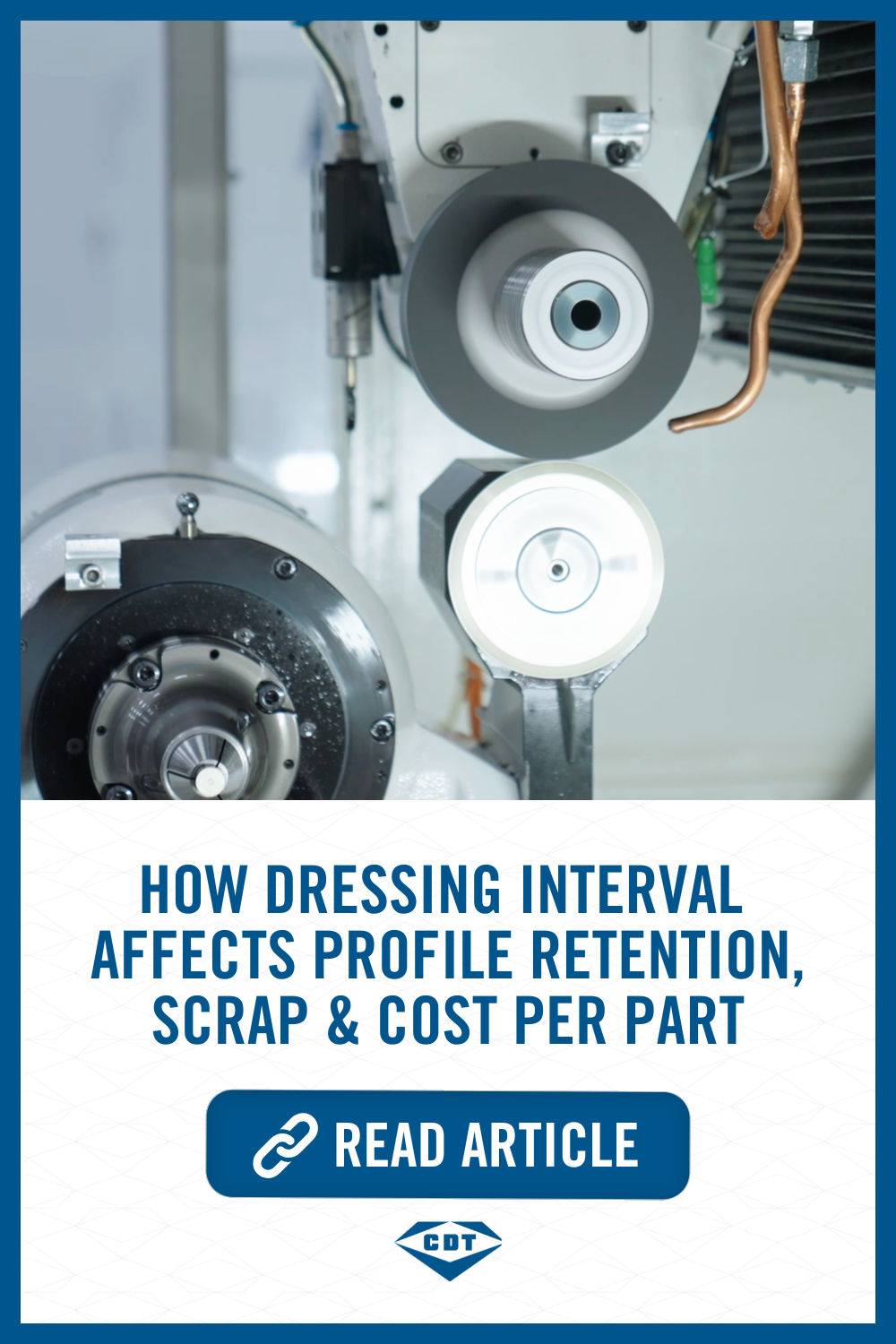 CDT maintains a team of experienced sales and application engineers who can support customers, when needed, in collecting and analyzing process data to identify the optimal dressing interval for their application. If a grinding process shows signs of instability, late-run scrap, or excessive tool wear, the dressing interval is often one of the most impactful process variables to review for improving overall performance.