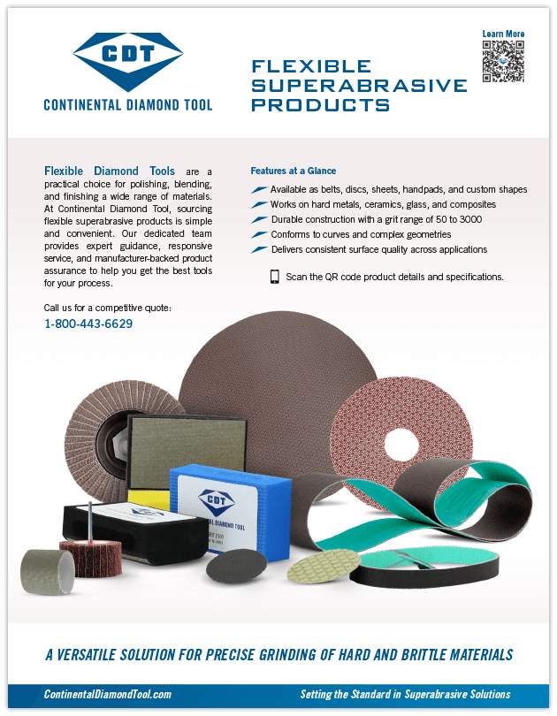 The team at Continental Diamond Tool is here to discuss your application and help you find the right superabrasive solution. While CDT produces a broad range of superabrasive grinding tools in-house, our flexible products are manufactured through trusted partners recognized for their consistent quality and reliability. These flexible diamond abrasives are engineered for hard, brittle, and demanding materials, and we’re pleased to offer them to our customers. Contact us for a competitive quote.